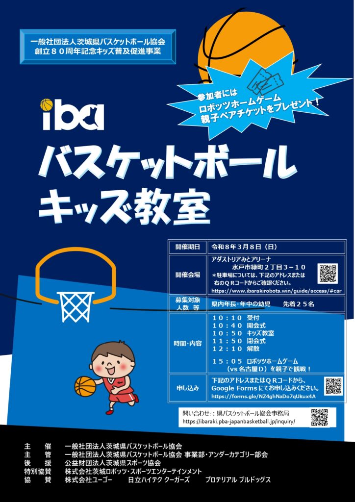 令和8年3月8日(日)アダストリアみとアリーナにて、バスケットボールキッズ教室開催します!詳細は下記チラシをご参照ください。お申込みはこちらから → https://forms.gle/NZ4ghNaDo7qUkux4A